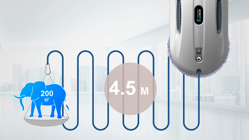 Для защиты робота при работе за окном от 2-го этажа и выше, робот комплектуется высокопрочным (200 кг) страховочным шнуром длиной 4,5 м. Таким образом, Вы можете быть уверены, что в случае непредвиденных обстоятельств, вы безопасно достанете своего помощника.